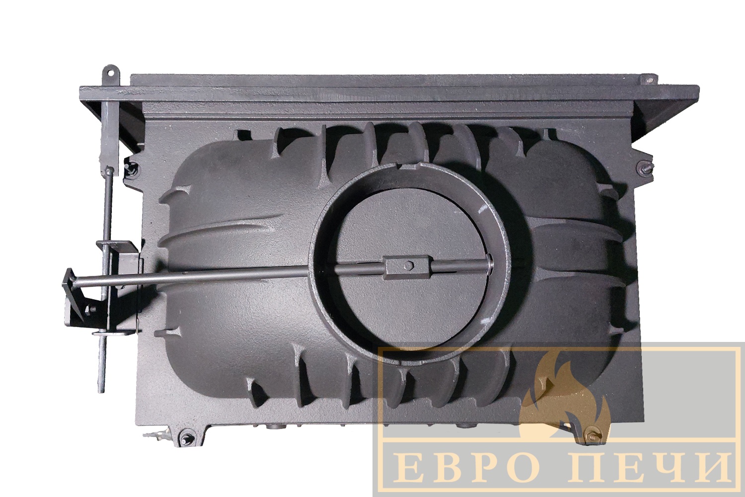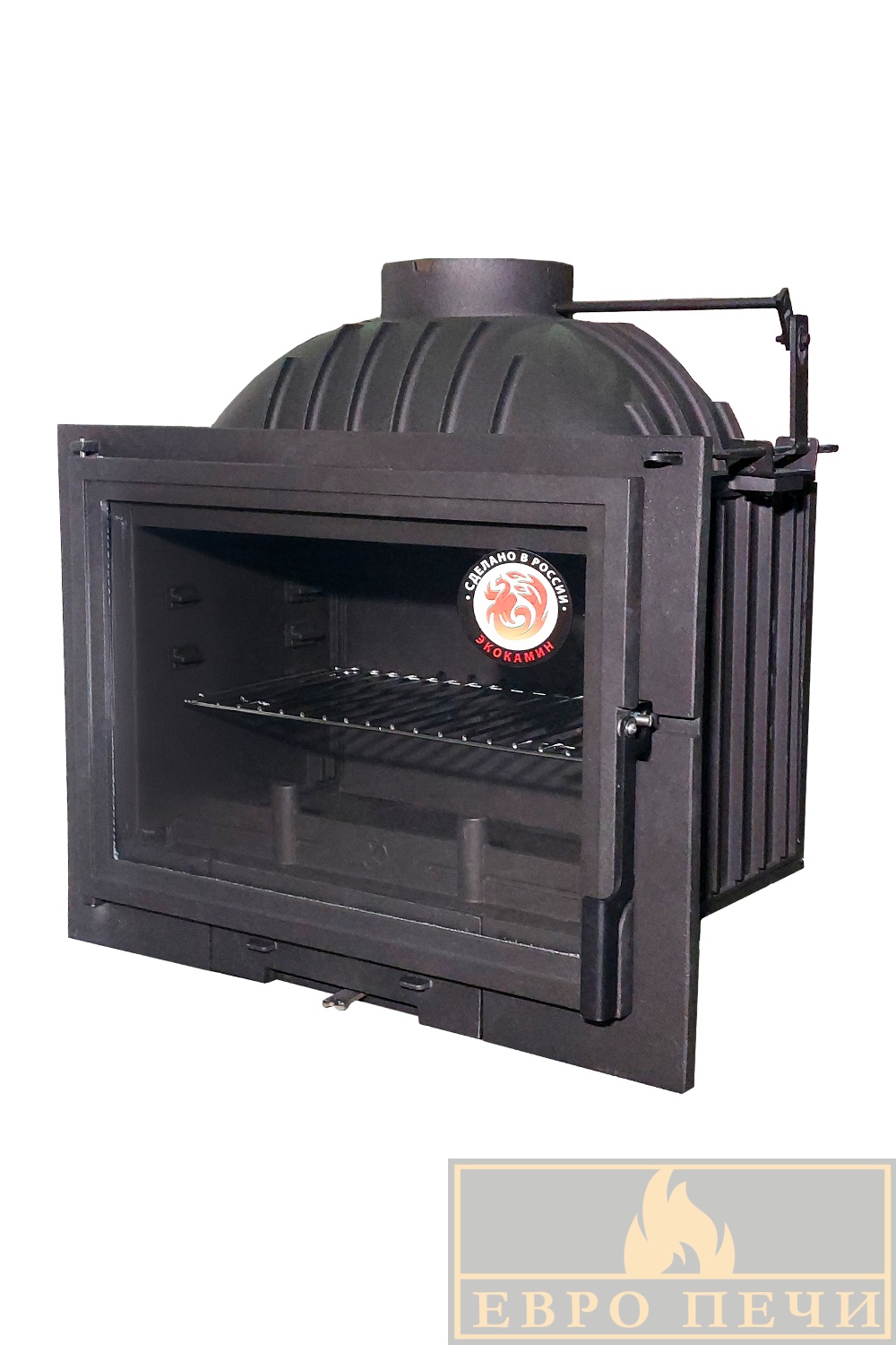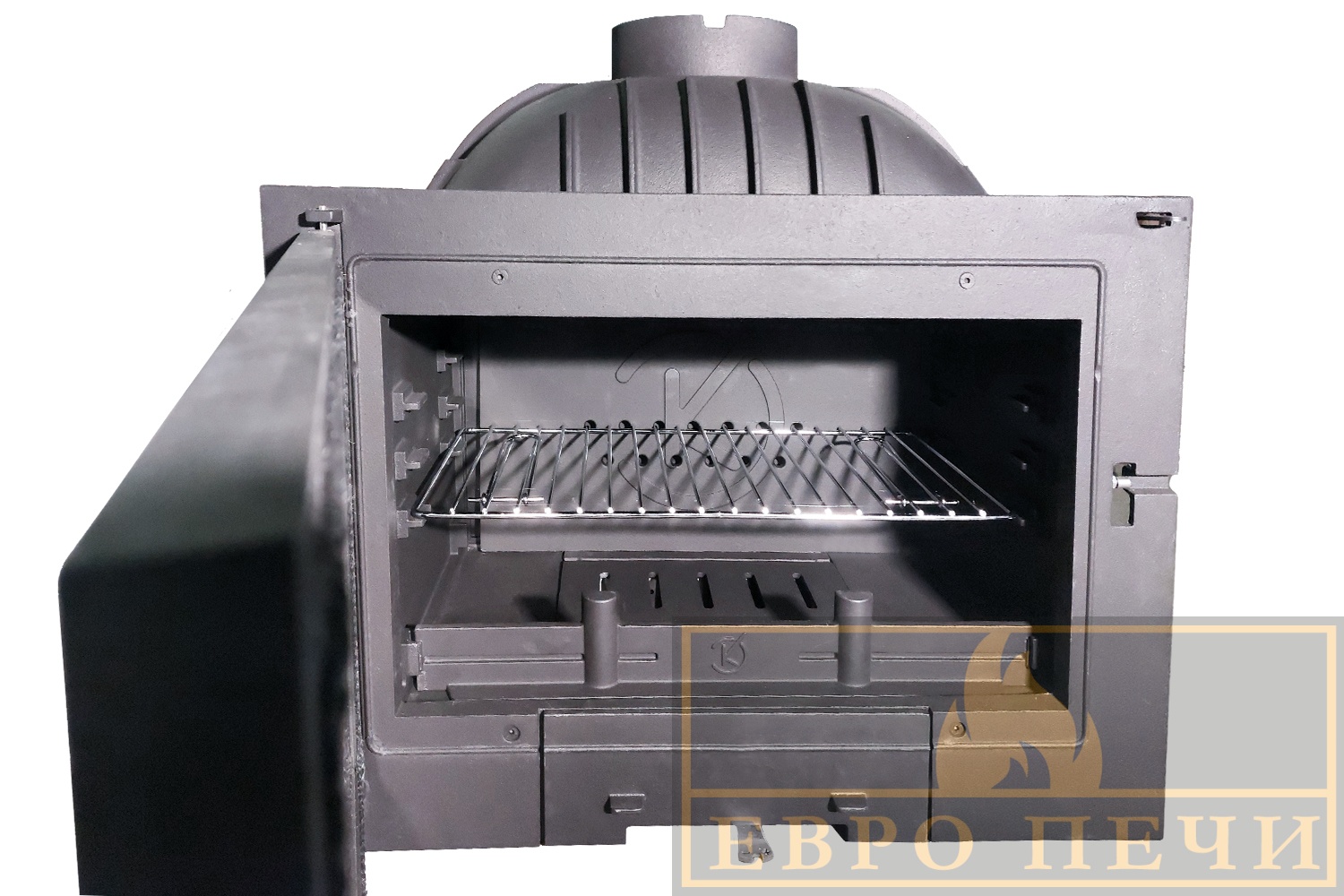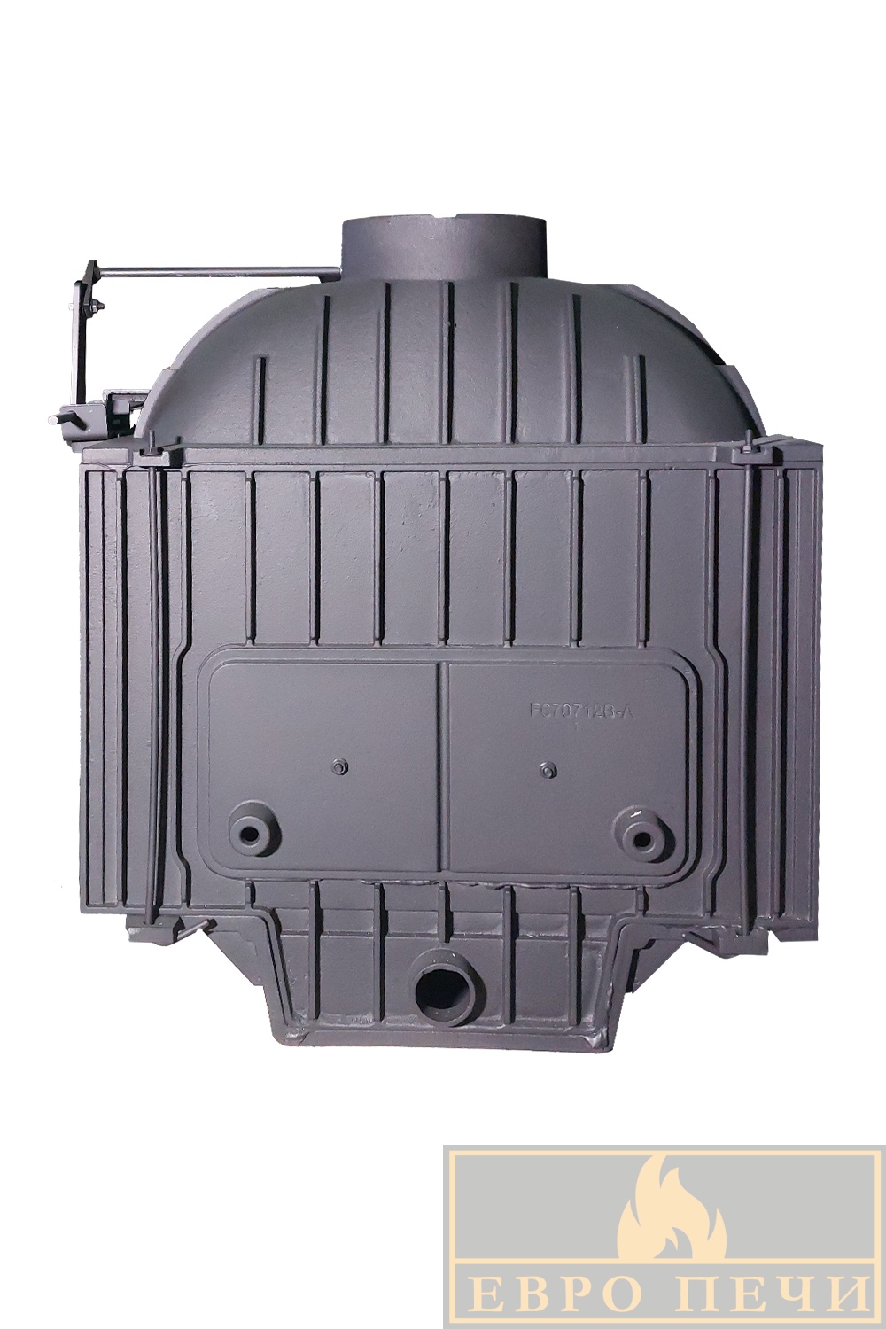 Односторонняя чугунная топка с прямым стеклом из термостойкой стеклокерамики, выдерживающей температуру до 750 °C и колосниковым типом горения.