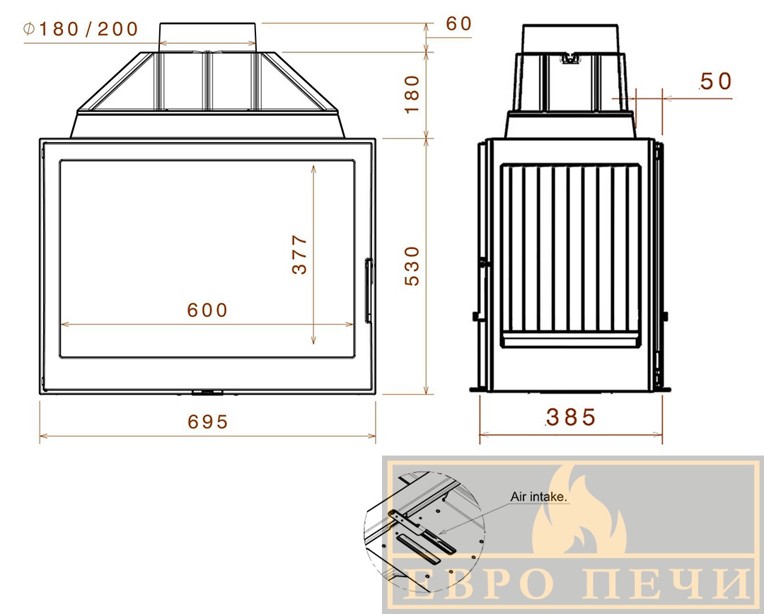 Чугунная топка с дымосборником. Патрубок для подачи воздуха извне приобретается отдельно.